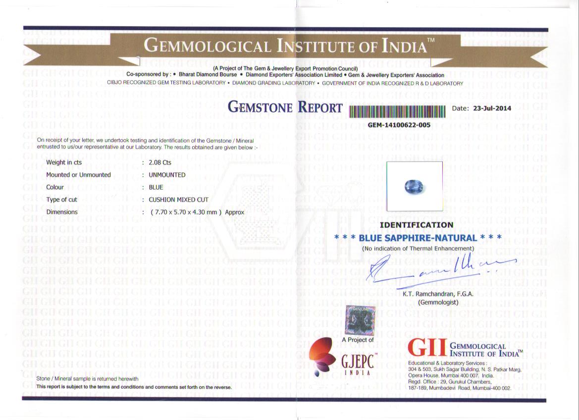 Blue Sapphire unheated certificate