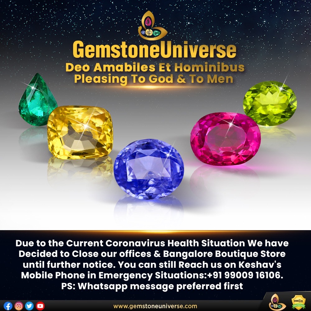 All Updates as and when necessary will appear on this page itself with date stamp For Daily updates as the Situation develops please see the posts at the Gemstoneuniverse Facebook Page by clicking here. Dear Patrons, Clients, Friends, Partners and Viewers, At the very outset thank you for the exemplary understanding of the emergency coronavirus situation. You have been exceptional. We hope and pray that you are healthy and happy and wish the same for your loved ones. You are well aware of the situation yourself so there is no need for lengthy explanations and expositions. Please refer to image above. For the greater good and containment we at Gemstoneuniverse have decided to suspend operations at office and store locations temporarily worldwide. These changes have been necessitated due to extraordinary developments including flight cancellations etc. We will try our best to give you support remotely. Some Delays are expected. Online Support by Email is available as of now Preferred Modes of Communication 1. Email 2. Whatsapp 3. Call only if required and emergency. These are the recommendations and plan of action for various services classified under relevant heads. Online Gem reports and recommendations As most of the people are working from home there is a sudden increase in Gemstone Recommendations. We will try our best to deliver these on time as stated on the Gemstoneuniverse website and service FAQ’S. Please bear with us in case of some delays as we co-ordinate across time zones and poor internet connectivity at some Places. Kindly refer to Guruji’s appeal in video embedded above. For face to face consultations at Gemstoneuniverse Centre of Excellence Bangalore We are aware that you have patiently waited for your appointment and booked your appointment several days in advance. All consults have temporarily moved online. All new Bangalore consultations with Abhijita Kulshrestha will also be done online. For Help and facilitating your consultations we shall call and co ordinate with you. In case you have the need to connect with us please call +91-9448207777 or connect with Mr. Johnson at +91-9591322720. Preferred timings: 10:30 am-19:30 PM IST( Indian Standard Time). For Time Zone converter please click here. Gemstoneuniverse Boutique Store Bangalore and walk in Patrons Store Operations at Bangalore will be closed from March 23, 2020 until further notice. All existing deliveries have been completed and patrons who have placed new orders have been communicated about approximate delivery times. International Shipments To USA/ Other International Locations: We will do our due diligence before shipping your package and will also take clerance from you personally before shipping your package. From March 23, 2020 – Till Clear information available. No Shipments will be done for the above specified time period. The foreign post office and appraisal staff for international shipments have temporarily stopped operations following the coronavirus guidelines. In addition to above several countries have closed borders and there is shortage of staff in vital positions. In such a situation tracking etc of the package is suspect. We highly recommend that we keep store your packages in our sealed vault and ship it as and when we can guarantee reasonably predictable outcomes and clear shipping and delivery information. This Notice below was posted on March 14, 2020( In Italics) . For majority of clients who followed these guidelines we have done the needful as per the information below. The USA has implemented stopping of all cargo movement to the USA routed through Europe for a month. This will cause delay in delivery of your packages. Your packages are ready and we recommend that we wait to ship your package till the situation normalizes. This will ensure safety of your package. Those who do not want to wait please inform us and we shall ship it. The customer care will be connecting with you with this same message to know your views. We shall do as per your decision. Shipments and Delivery Times In India India has entered into the critical phase of this pandemic( There is a lockdown till April 14th as of now). We will keep your packages ready and ship when there is reasonable and tangible information and guarantee of delivery. For clarity on shipping in India in case of further queries kindly send us an email. Gemstoneuniverse Factory and Workshops The factory and workshops where your rings and pendants get made will remain closed from March 23, 2020- April 14th, 2020 till further notice. We will communicate real time as the situation unfolds. In case you feel the need to reach out please reach out to us by email. International Appointments and partners: We suggest that you suspend all non essential travel for 3 months till this situation normalizes. We are doing the needful for those who have already scheduled their appointments. The needful has been done with reasonable good outcomes for already scheduled appointments and meetings. Gemstone Prices and supply chain: We have reported on our Facebook page about the latest situation in demand, supply and prices. Scarcity is predicted for Good quality Gemstones and prices will move higher. As per Gemstoneuniverse promise and tradition followed for 23 years once a Gem is listed at a particular price we never change the price however extraordinary the situation economic or otherwise.( Please note that sometimes slight price changes occur due to real time currency movement and exchange rates as mandated by the RBI( Reserve Bank of India). We have no control over this. From our side there is one universal price worldwide. The aware ones amongst you will factor in currency value fluctuations and gold prices- Our duty at Gemstoneuniverse is keep you aware and ready! - A Gem is for a Gem. What is destined for you will be yours and nobody can change that. Some other links given below for relevant information. Do click and read if inclined: An order was p