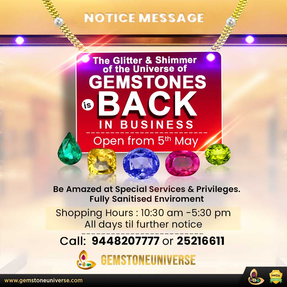 Either the package declares something else that it does not contain- that is misrepresentation or there will be legal hassles and duties involved. All International packages containing real and precious Gems and Jewellery Sent from India should be legally appraised. Please do not give in to rumours or end up in a losing proposition. You are welcome to reach out to us in any which way if and when you need. We are here for you. We hope that the semblance of Normalcy returns soon and all of us are safe, happy and our productive best. Thank You, Team Gemstoneuniverse-The Gold Standard in Planetary Gemology Deo Amabiles Et Hominibus- Pleasing to God and to Men. Gemstoneuniverse Coronavirus Update June 9, 2020 Dear Gemstoneuniverse Patrons, Clients, Viewers & Partners, We hope that you and your loved ones are safe and healthy in this time. Thank you for your patience and support that has bolstered our spirits and your confidence in us gives us new direction and hope. Effective June 9th, 2020 until further Notice. Clicking on underlined hyperlinks will give more information about a particular topic. You can always come back to this page. Dear Patrons, Clients, Viewers- The Government of India has extended the Lockdown partially due to COVID-19 to June 30, 2020. The Gemstoneuniverse Boutique Store is open from 10:30 am to 5:30 pm IST, on all days (except Sunday’s) till further notice. The original Coronavirus Advisory & POA that was issued by Gemstoneuniverse On March 15th 2020 still holds good and is at the top of The Home Page and every single page at Gemstoneuniverse. Please find the section relevant to you below: Gemstone Reports, Recommendations, Astrological consultations at Bangalore Boutique Store. All Gemstone reports are being e-mailed on Time to our patrons (We are pleased to have maintained our 23 year record - Not a single delay) and all Astrological consultations (You data is confidential & Private like always and no recordings are kept) have moved online. No personal one to one consultations at present at our Gem Gallery. For all astrological consultations at Bangalore please note that the consultation will be online only. Consulting Chamber Facility: If you want to come down to the Bangalore Boutique Store we can extend you the facility of private chamber that is sanitized and secure, a secure encrypted connection, a laptop, privacy so you can get your consultations done. This is available only by prior appointments and we recommend that you bring your own headphones etc for safety and sanitization. To reserve a private chamber please call +91-9448207777 Bangalore Boutique Store and delivery at Bangalore The Gemstoneuniverse Bangalore Boutique Store is operational from 10:30 am IST to 5:30 PM IST (Monday to Saturday) observing all safety and sanitization measures. Making an appointment is greatly appreciated though, to help us adhere to the safety protocols and make arrangements. You can get in touch with us at +91-944820777 as per the office hours stated above. All deliveries at Bangalore are on time. Domestic Shipments: We have started the shipments of domestic online orders (within India) . The postal authority is taking the booking and packages are being delivered within India, to places which are marked safe zones. There are no shipments to places which have been classified as contaminated zones by the government. Hence before doing the final shipment, we are taking the final confirmation with our patrons and then only doing the shipment. We will call you once your package is ready and only after taking your assent we shall ship the package. If your delivery address is in safe zone within India, then the package shall be shipped, after your confirmation. However the packages are taking slightly longer for final delivery. Packages are taking between 5 to 10 business days’ time for the final delivery within India. The shipments to Mumbai, Pune and Thane (and few other cities of Maharashtra and India), are currently on hold, as many places in these cities are marked as contaminated zones and the post offices in these cities are still not fully operational. International/ Export Shipments: The international shipments / all export shipments are currently not being done/ on hold, as the international flights have not resumed. This shall take some time till we have confirmed updates from postal authorities that the packages are shipped and delivered abroad. Orders are being processed on a first come first served basis and we shall keep your packages ready and consecrated in the vault and ship them as soon as there is some predictability in tracking, concrete proof of delivery once the international cargo flights resume. However as soon as your package is ready we shall inform you of the same by email. From Bangalore, India, the precious gems and jewellery is exported by the Postal Mode only after appraisal as per law. Currently limited availability flights for essential items such as medicines etc are only operational. As soon we have an update you will see it here. As soon as the International shipping for precious gems and jewellery commences, we shall keep all our patrons, informed. Gemstoneuniverse Factory and Bench Jewelry Workshops The factory and workshops where your rings and pendants get made are fully operational now and all rings/ pendants etc are being made as per the timelines and priority. In case you feel the need to reach out please reach out to us by email. International Appointments and partners: We suggest that you suspend all non-essential travel for 3 months till this situation normalizes. We are doing the needful for those who have already scheduled their appointments. The needful has been done with reasonable good outcomes for already scheduled appointments and meetings. Gemstone Prices and supply chain: We have reported on our Facebook page about the latest situation in demand, supply and prices. Scarcity is predicted for Good quality Gemstones and price