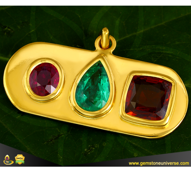 Customized Gold Pendant Design - Can be made for all Navaratna. Classic design with three Gemstones set in bezel setting in a plate form. Our bench jeweller shall access the dimension of gem and confirm if the selected design can be made for the selected gemstone or not. For pointers for selecting the best designs please click here