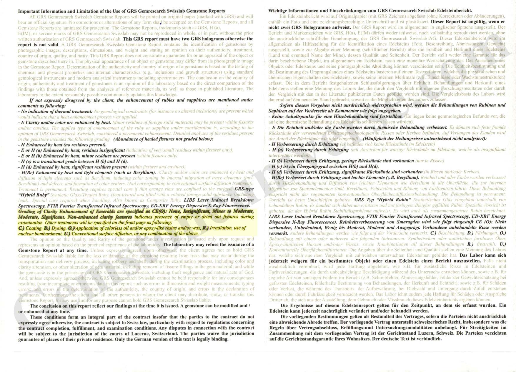 The world of jyotish quality gemstones accepts cedarwood oiled emeralds. Now the big question is that even in oiling, what extent of oiling is and what is acceptable? Produced below are two images of the gem report issued by the GRS Gem Research Swisslab, which explicitly define the level of treatment in their comments. The GRS website lists the criteria for evaluation as thus:
