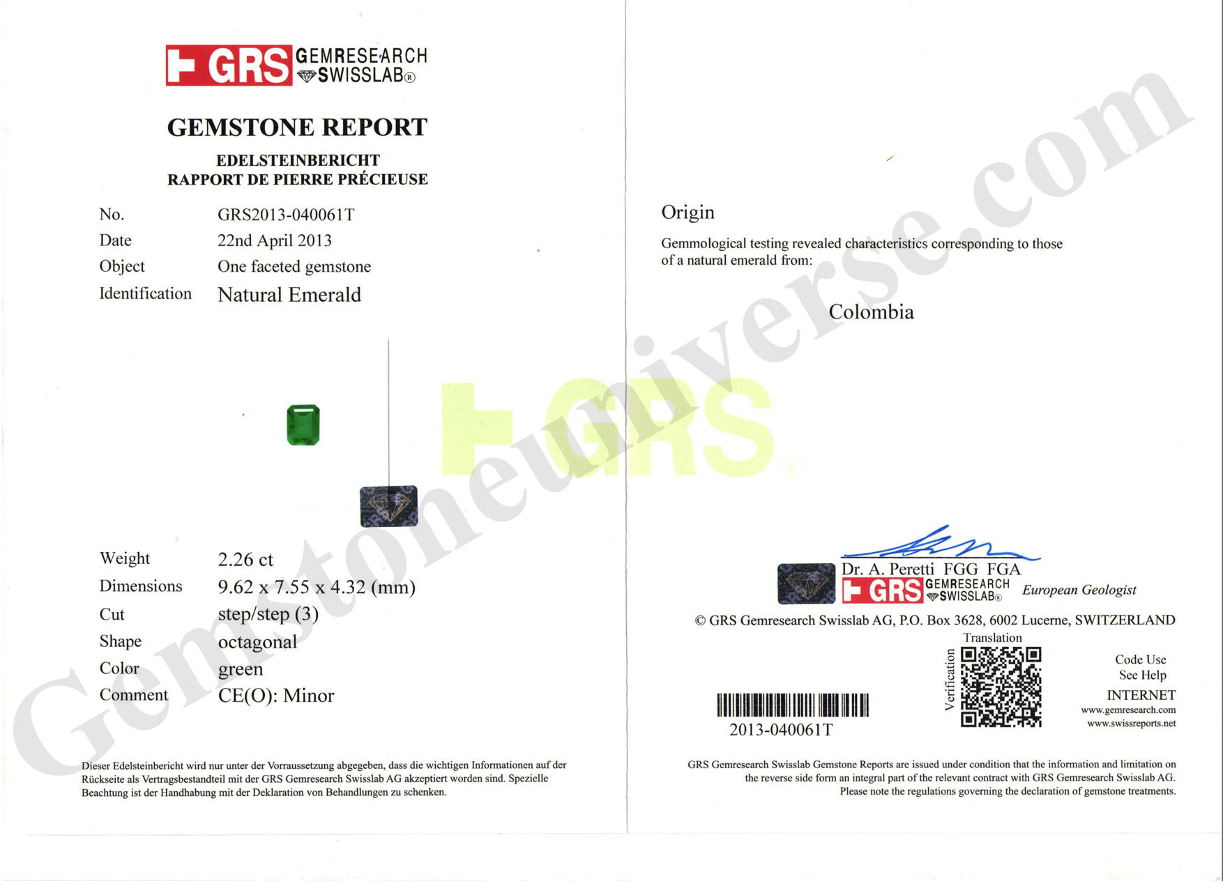 Based on the above notations, the assessment of the emerald reads that it is a natural emerald of Colombian origin with comment - CE(O) indicating Clarity enhancement (oil). The comment further reads “minor”.