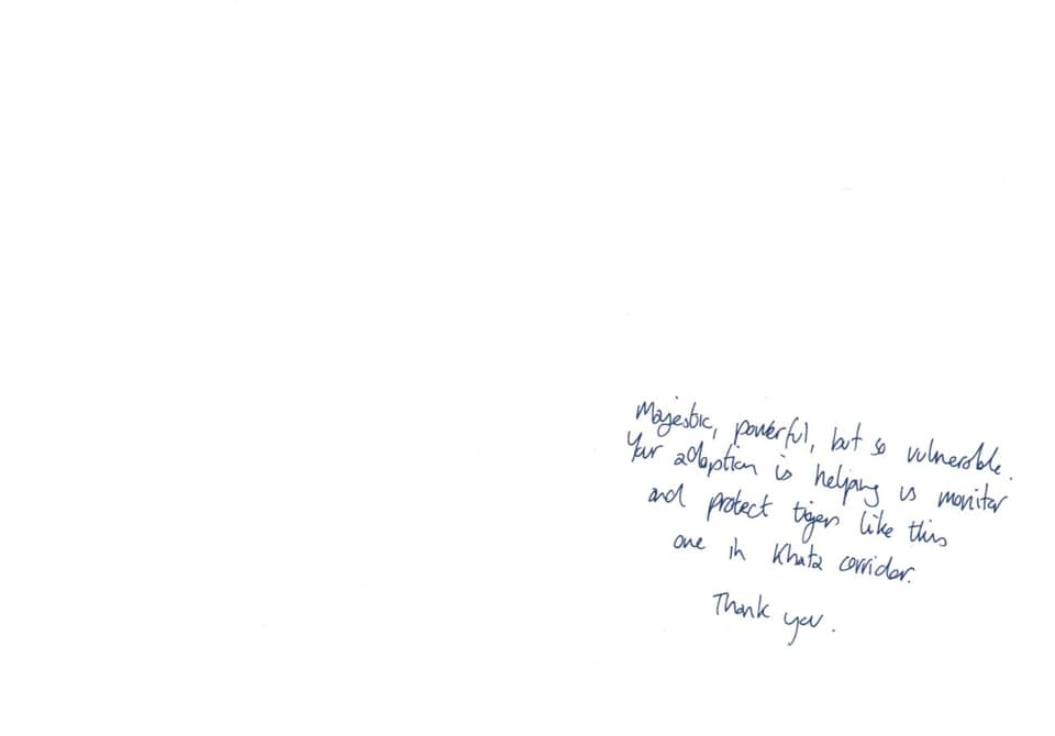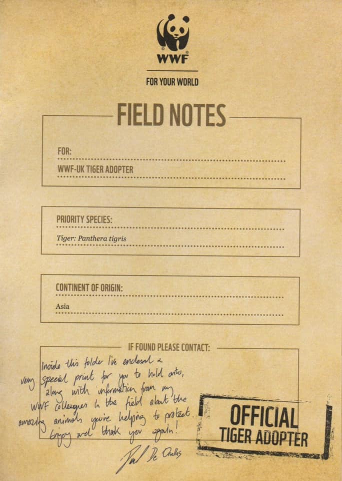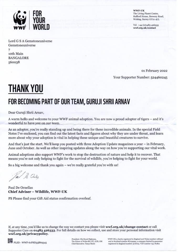Thank You note from WWF to Guruji Shrii Arnav for adopting the First Tiger Cub in Chinese New Year of Tiger