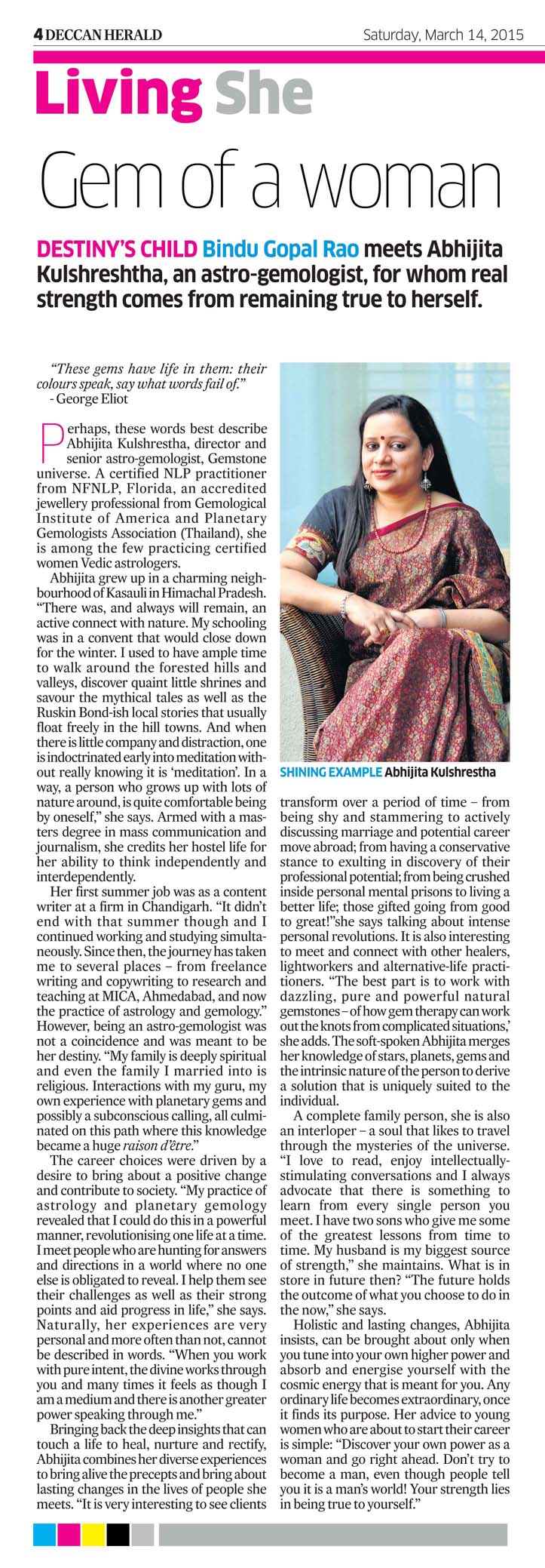 Perhaps, these words best describe Abhijita Kulshrestha, director and senior astro-gemologist, Gemstone universe. A certified NLP practitioner from NFNLP, Florida, an accredited jewellery professional from Gemological Institute of America and Planetary Gemologists Association (Thailand), she is among the few practicing certified women Vedic astrologers.