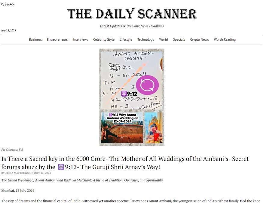 ARTICLES: Is There a Sacred key in the 6000 Crore- The Mother of All Weddings of the Ambani’s- Secret forums abuzz by the 9:12- The Guruji Shrii Arnav’s Way - On the Front Page & Trending Section - The Daily Scanner