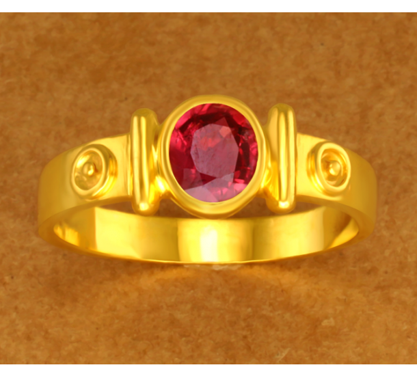 18K Planetary Bhasma Gold Ring Design for Planet Sun gemstones. Vedic symbol of Planet Sun being inscribed on the ring shanks - on either side of gem. Special Planetary Bhasma design with Gemstone set in bezel setting. Our bench jeweller shall access the dimension of gem and confirm if the selected design can be made for the selected gemstone or not. For pointers for selecting the best designs please click here