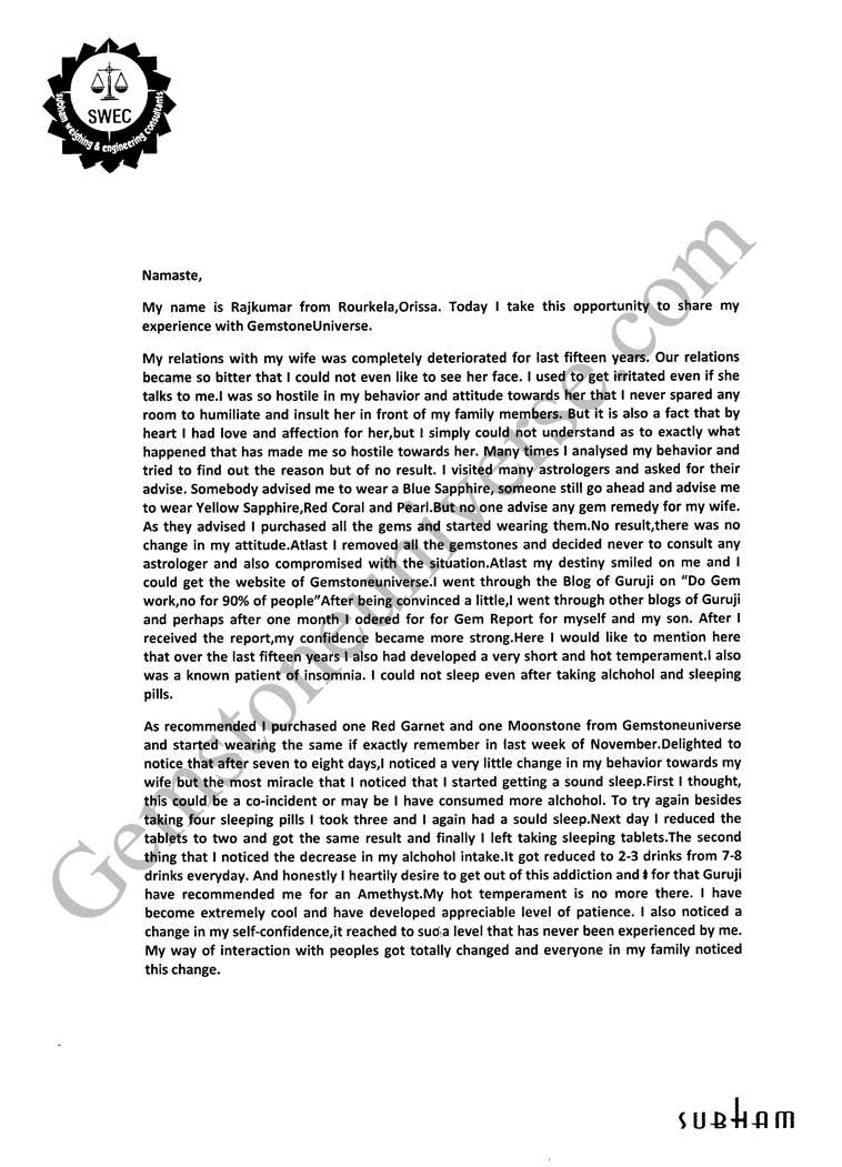 He has even documented his story in a letter and signed it. “It is my desire that maximum people should benefit from planetary gem therapy, the way I have been. And if telling my story can help someone make a wise choice, in ones own favor, so be it”, he says.