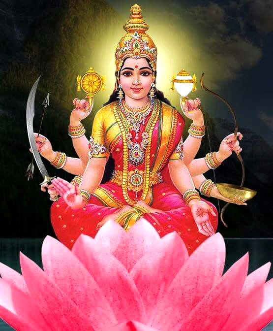Vijaya Lakshmi (Mother who can bestow Victory): In this form the Mother is Eight-armed, in red garments, carries chakra, shankh, sword, shield, lotus, paash, other two hands depicting abhaya mudra and varada mudra. Vijay is victory. Vijay is to get success in all undertakings and all different facets of life. Some are strong physically but weak mentally, while others are economically rich but poor in their attitude and cannot exert any influence. Vijay is to have all encompassing victory. Vijay is to rejoice in glory of our real nature - Vijay is to conquer the lower nature. Vijay is the victory in external and internal wars and of course eternal wars! Hence those, with grace of mother Vijay Lakshmi, have victory everywhere, at all time, in all conditions.