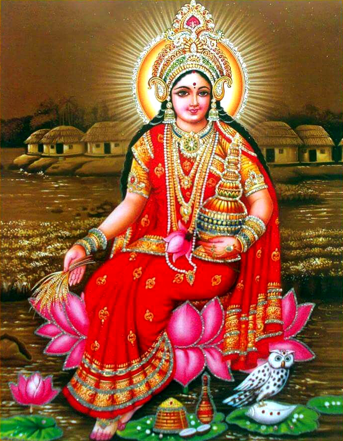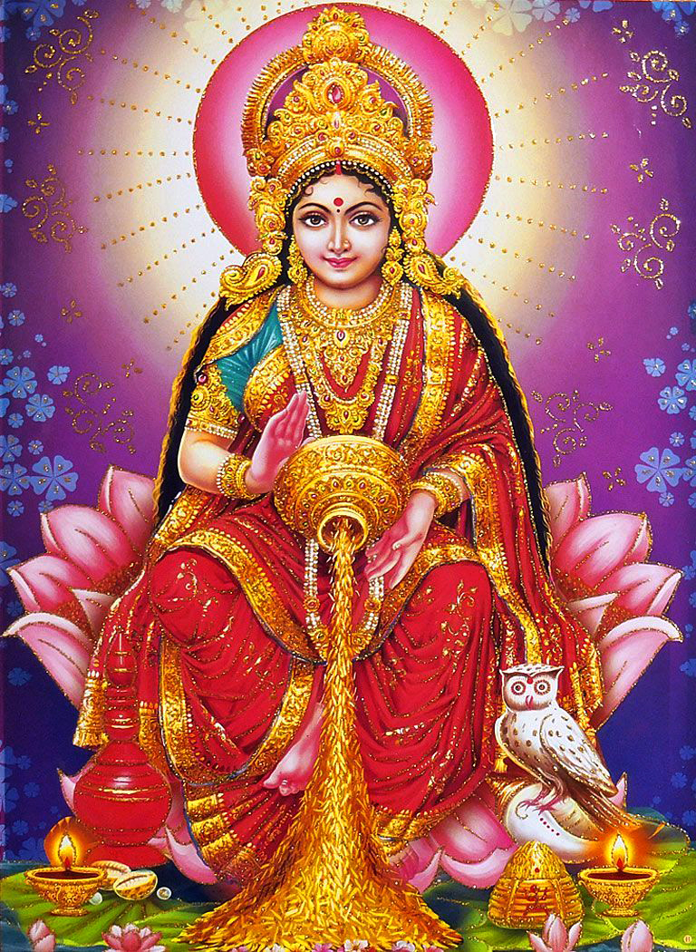 The word "Lakshmi" is derived from the Sanskrit word "Laksya", meaning 'aim' or 'goal', and she is the goddess of wealth and prosperity, both material and spiritual.