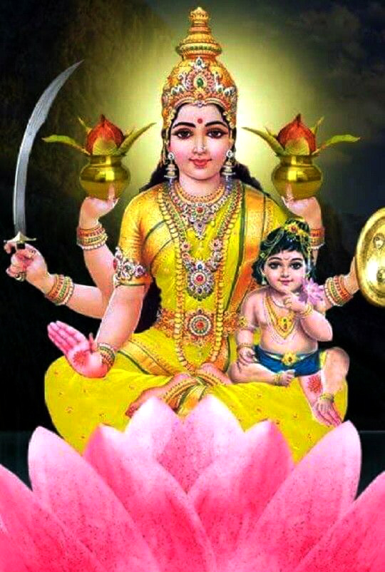 Santan Lakshmi (She who can bless with progeny): In this form the Mother is six-armed, carries two kalashas (water pitcher with mango leaves and a coconut on it), sword, shield, a child on her lap, a hand depicting abhaya mudra and the other holding the child. The child holds a lotus. SANTAN means children. To be blessed with children who bring joy in your life, children who will make you proud of them, is the blessing of the Divine Mother in this form. Children are the greatest treasure. Those who worship this particular form of Sri Lakshmi, known as a Santan Lakshmi, are bestowed with the grace of mother Lakshmi and have wealth in the form of desirable children with good health and a long life.
